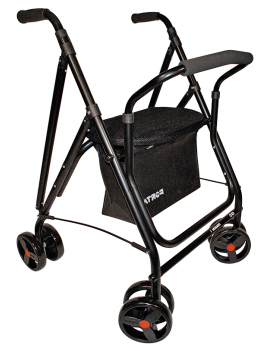 Andador con frenos por presión, con asiento, cesta y respaldo.