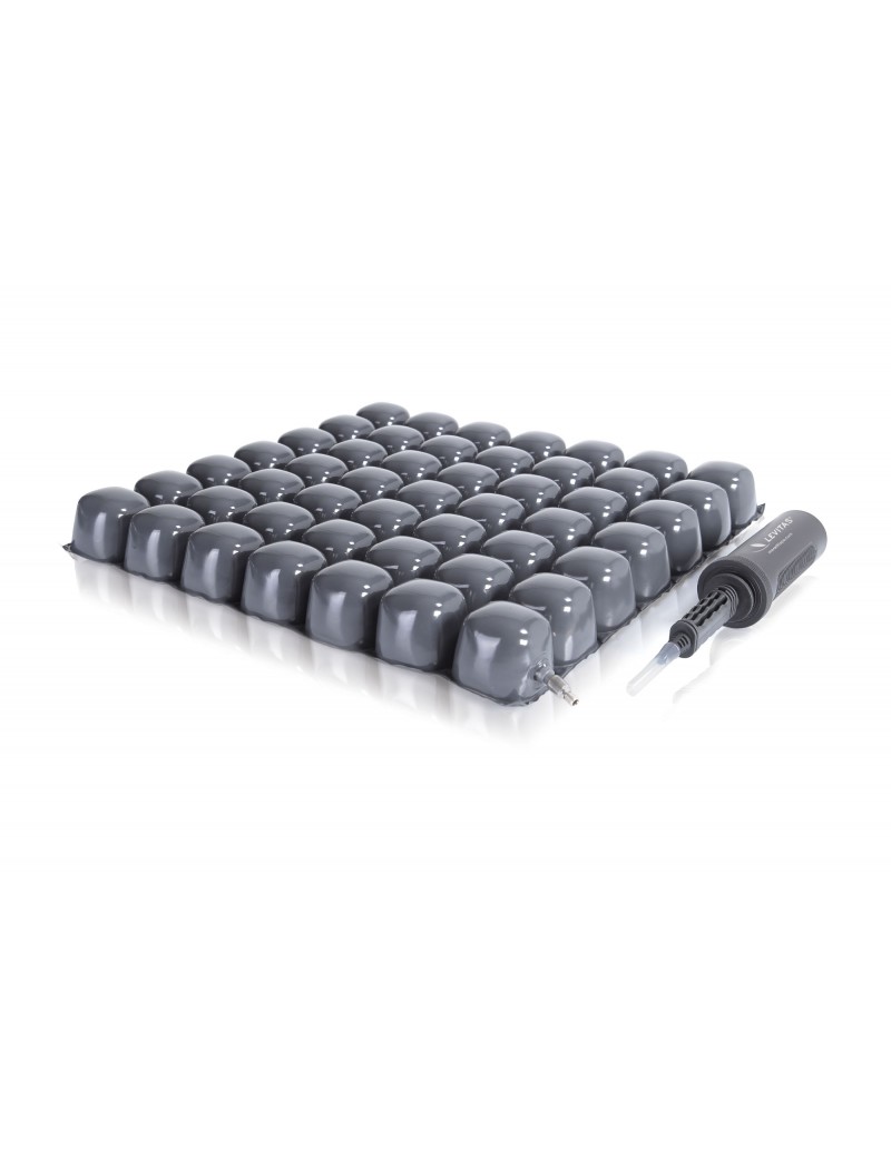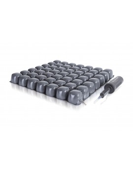 Cojín antiescaras con burbujas de aire que mejoran la presión en la posición de sentado del paciente. Cojín con funda impermeable y antibacteriana que por su elasticidad facilita la labor de limpieza. Funda antideslizante. El cojín con burbujas de aire se ha planteado para ayudar al paciente a mantenerse en equilibrio y para protegerle de la formación de escaras y lesiones en los tejidos