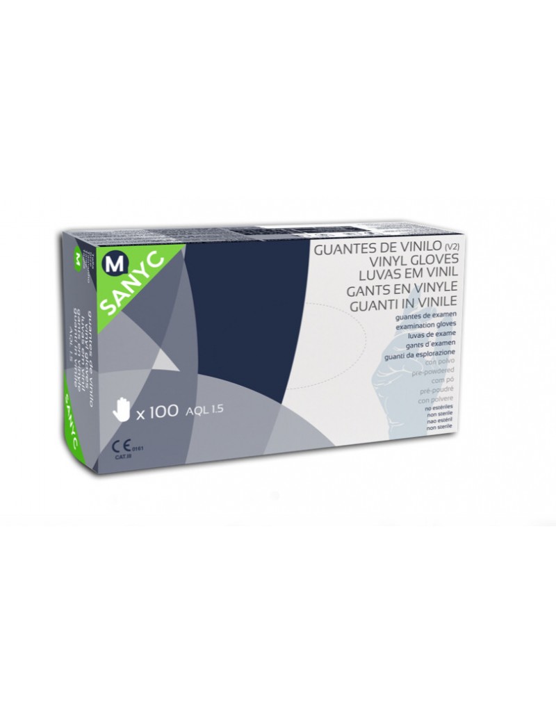 Guantes de vinilo en cajas de 100 unidades.La presentación puede variar.