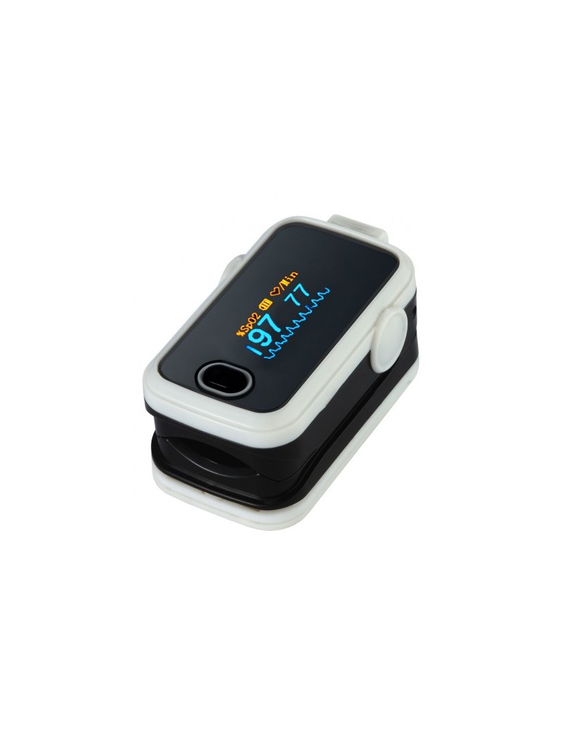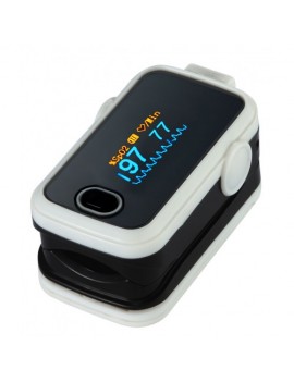Pulsioxímetro de dedo para medición no invasiva de la saturación de oxígeno en la sangre y medidor de ritmo cardíaco.