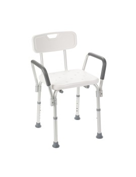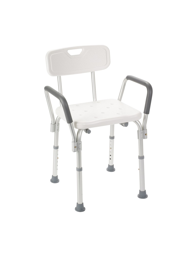 Silla de ducha regulable en altura, con brazos extraíbles y respaldo. Asiento que facilita la labores de aseo, con regulación de la altura para la correcta adaptación a cada apersona.